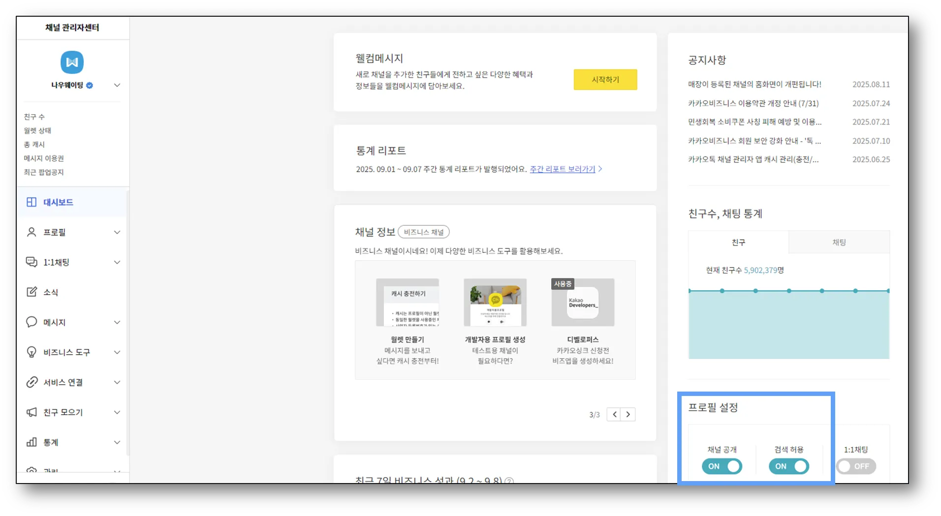 * 위 설정이 되어있지 않으면, 카카오톡 채널 검색이 불가능합니다.