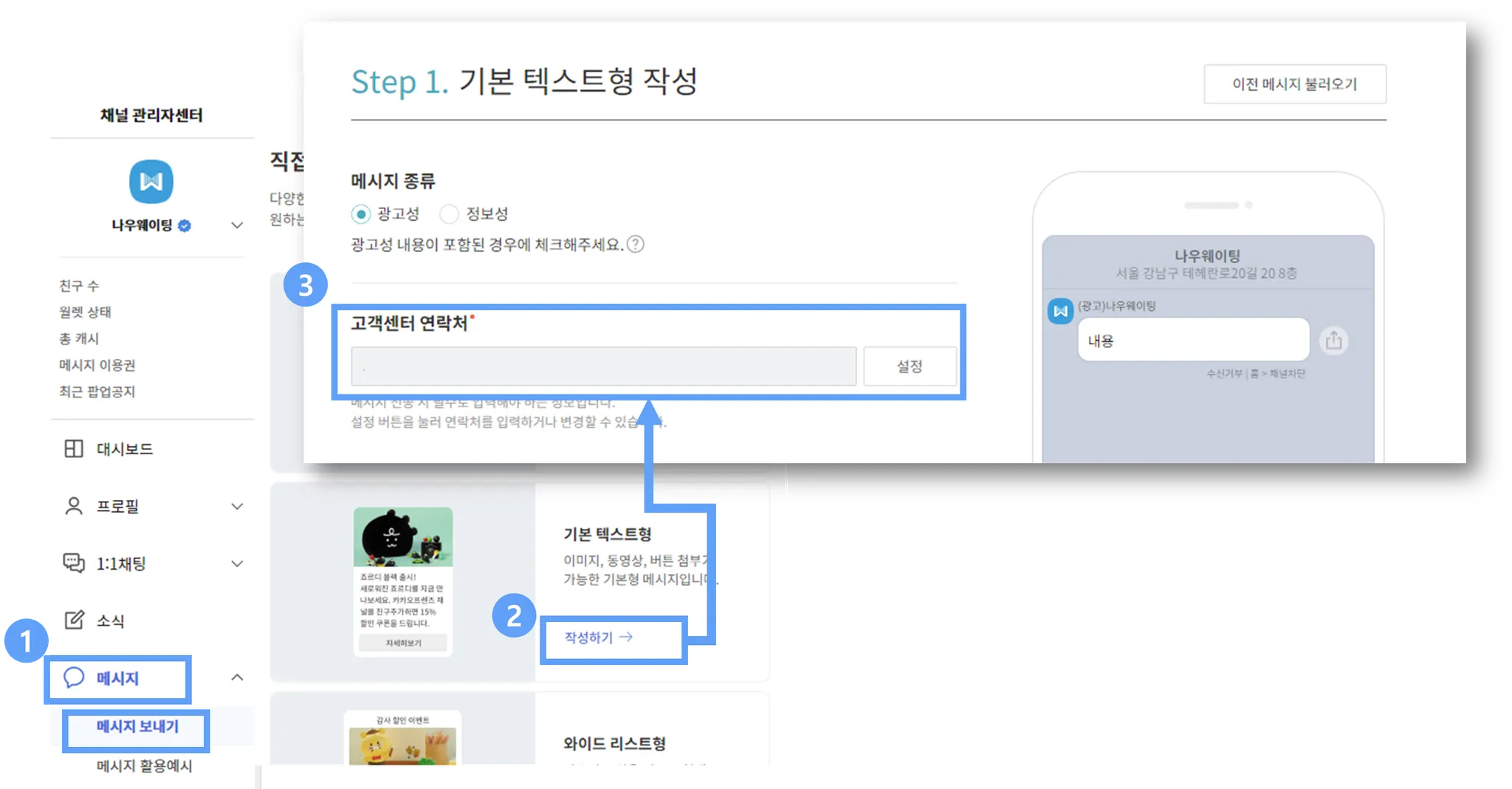 메세지 > 메세지 보내기 > 기본 텍스트형 [작성하기] > 고객센터 연락처 부분에 실제 매장의 주소 혹은 고객센터번호를 입력하신 후 저장 버튼만 눌러주시면 됩니다. (하단에 다음 버튼은 별도로 누르시지 않아도 됩니다)