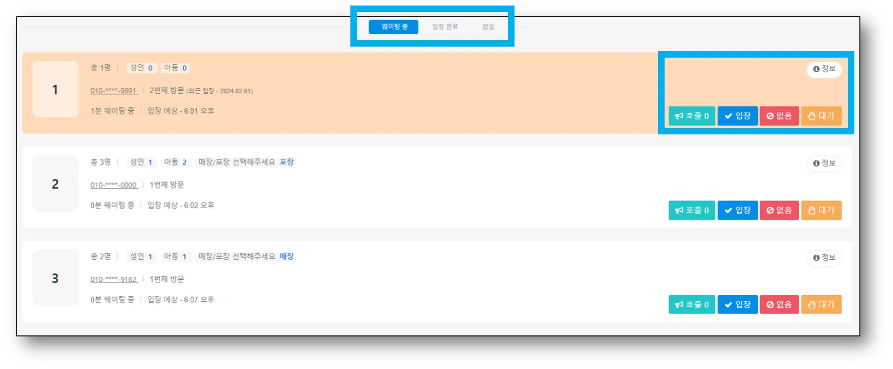 입장 : 호출한 고객이 입장하면, [입장]을 눌러주세요. 웨이팅 중 리스트에서 사라지고, 입장완료 탭으로 이동 합니다.