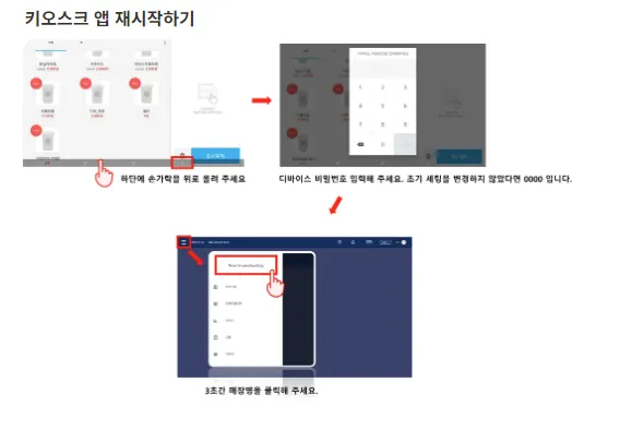 1) 사장님센터 내 메뉴 정보를 변경한 후에는 포스/키오스크를 재시작하거나, 재부팅을 해주셔야 수정된 내용이 반영됩니다.