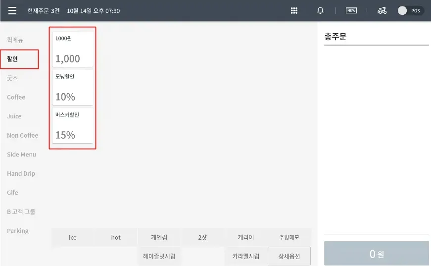 할인 등록 시 나우웨이팅 포스 왼쪽 메뉴에 할인 키가 생성됩니다.