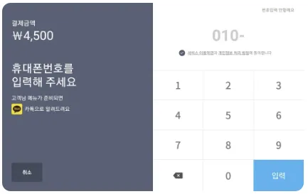 우측 하단에 있는 결제 버튼을 누르면 전화번호 입력화면이 나옵니다.
