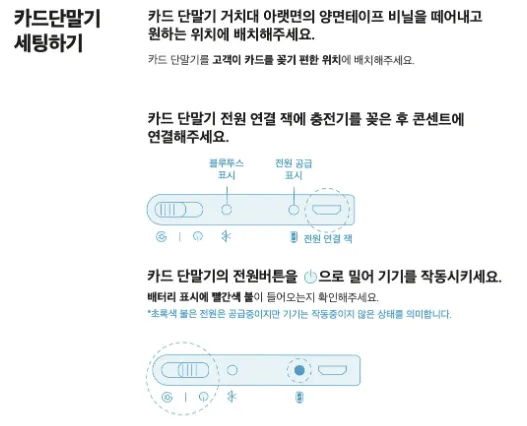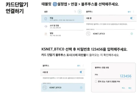 블루투스 카드 단말기를 태블릿 포스에 연결하는 방법을 설명드립니다. 아래 내용을 확인해주세요.