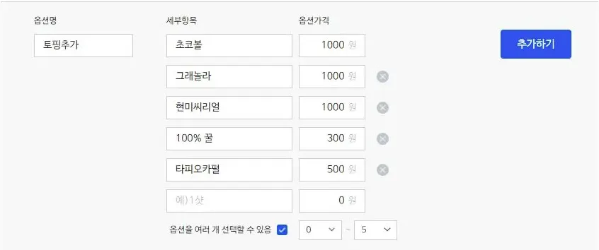 한 메뉴에 여러 옵션을 선택할 수 있는 토핑, 사이드메뉴 등의 메뉴 옵션에 사용해주세요.옵션별로 세부항목에 가격을 설정하면 주문 시 상품 가격에 해당 가격이 추가됩니다. '옵션을 여러개 선택할 수 있음' 체크박스 체크 시, 고객은 세부항목을 여러개 선택할 수 있습니다.상품에 옵션 매칭 시에는 해당 옵션이 '필수' ,'선택' 인지 반드시 지정해야합니다.