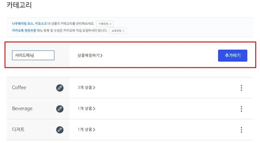 카테고리는 커피류, 주스류, 베이커리류 등 메뉴들의 그룹명입니다.