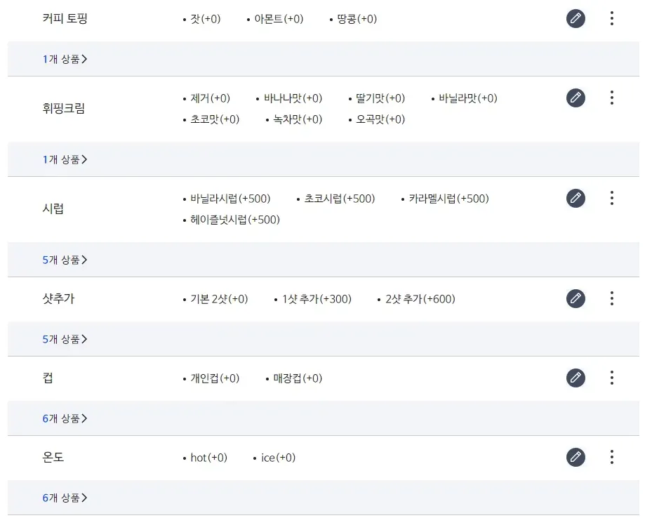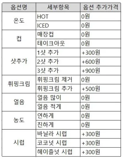 옵션은 Hot/Iced, 일회용컵/머그잔, 샷추가 등 고객의 선호에 따라 선택할 수 있는 사항입니다.