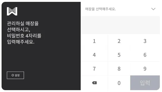 3) 매장 선택 후, 비밀번호 0000을 입력해주세요.* 관리 매장이 1개라면 따로 매장 선택을 하지 않아도 됩니다.
