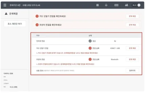 5) 카드단말기 연결 > 문제해결을 눌러서 카드단말기가 잘 연결되었는지 확인해주세요.