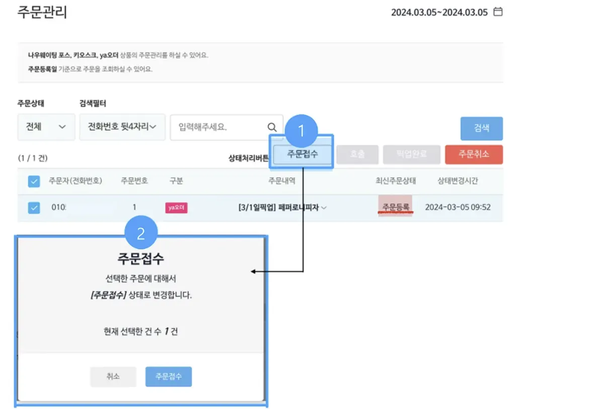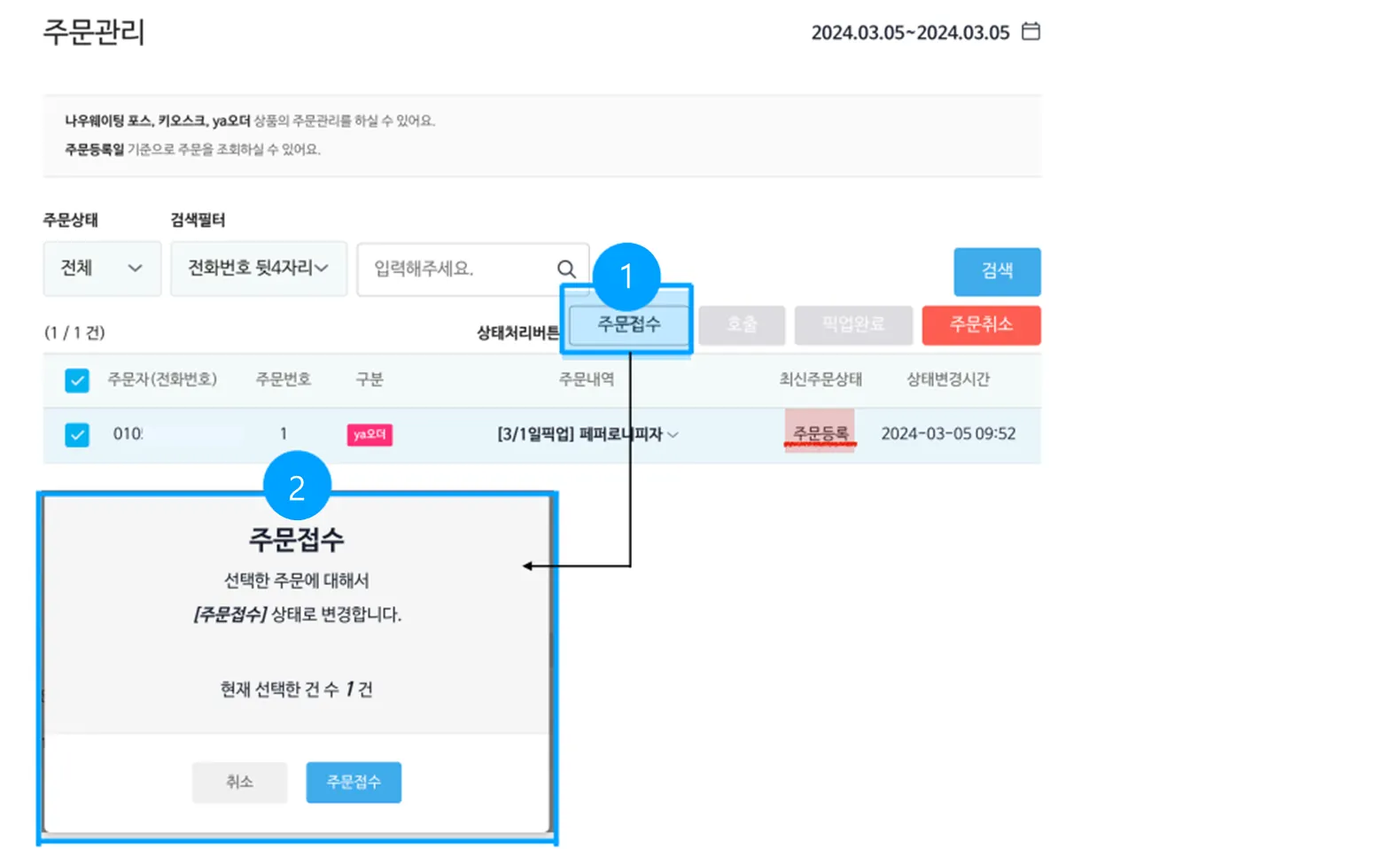 해당되는 주문 건의 왼쪽 체크박스를 선택하신 뒤 ①[주문접수] 버튼을 누르시면 ② 주문접수에 대한 팝업이 노출되고 팝업 내 오른쪽 주문접수 버튼을 눌러 주셔야 주문접수 처리가 됩니다.
