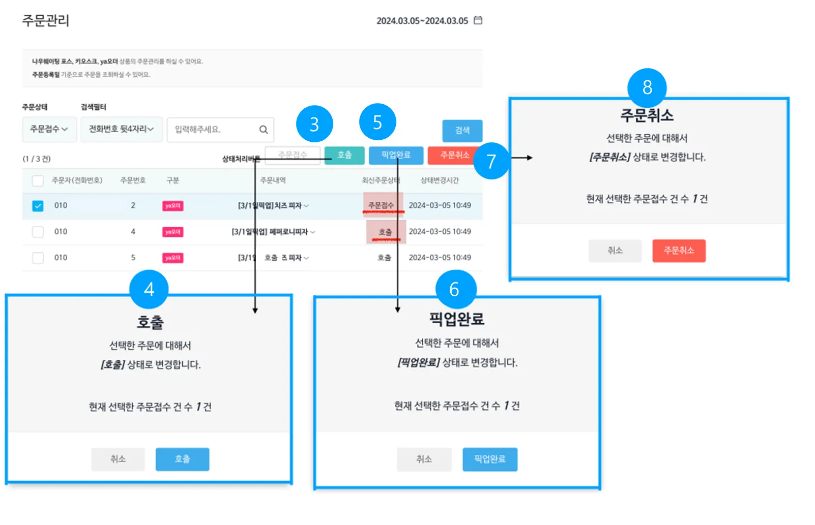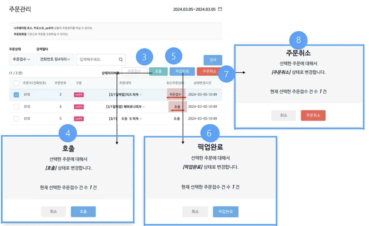 [주문접수] 상태가 되어야 호출 / 픽업완료 기능을 사용할 수 있습니다.