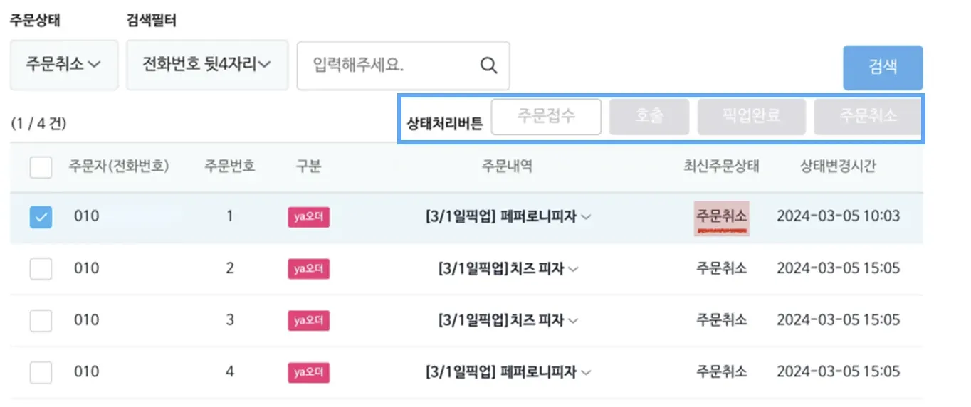 ※ 사장님센터 내의 주문취소 : ya오더만 사용 가능 (포스,키오스크의 결제 취소는 결제하신 기기에서 직접 취소 부탁드립니다)