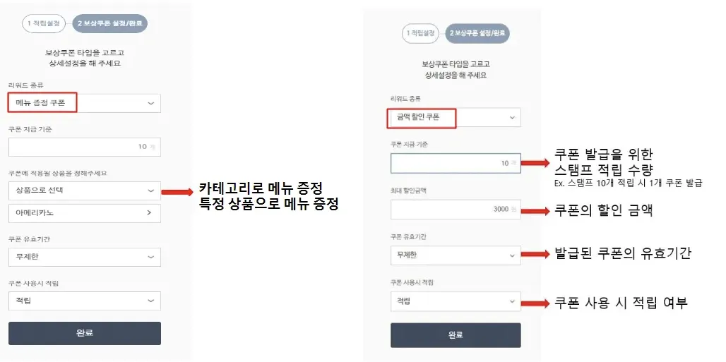 리워드 종류 : 메뉴 증정 쿠폰 OR 금액할인쿠폰