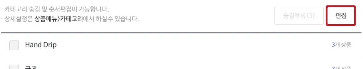 2) 카테고리 목록의 [편집]버튼을 눌러주세요.