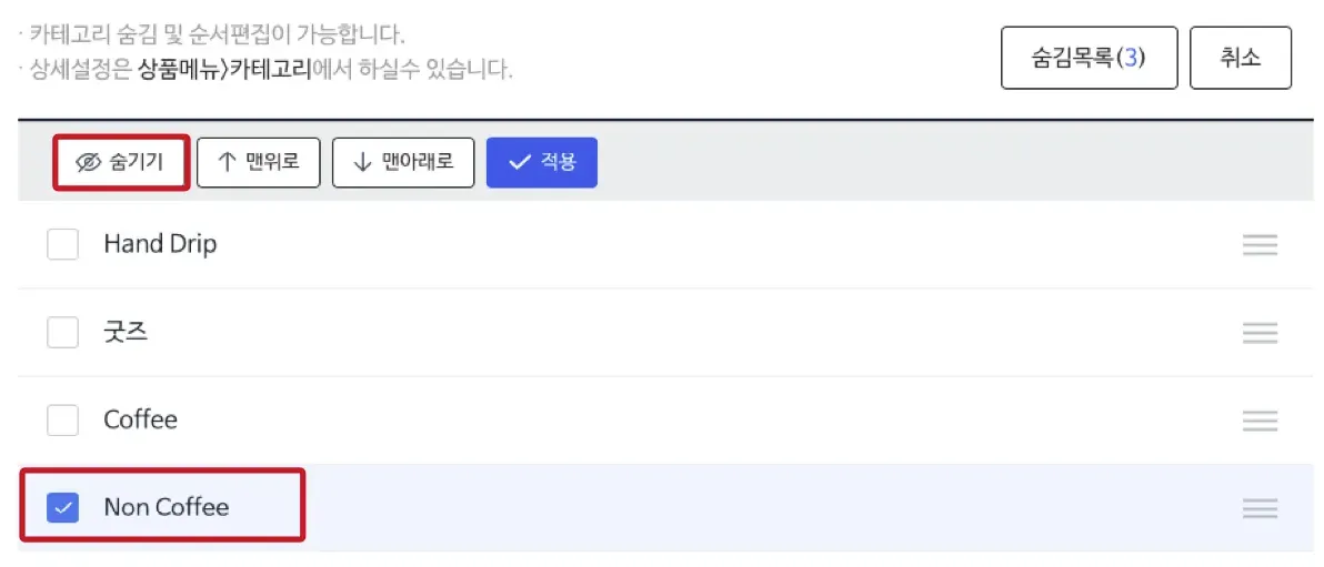 3) 숨기기 원하는 카테고리를 선택하시고 [숨기기] 버튼을 클릭하세요.