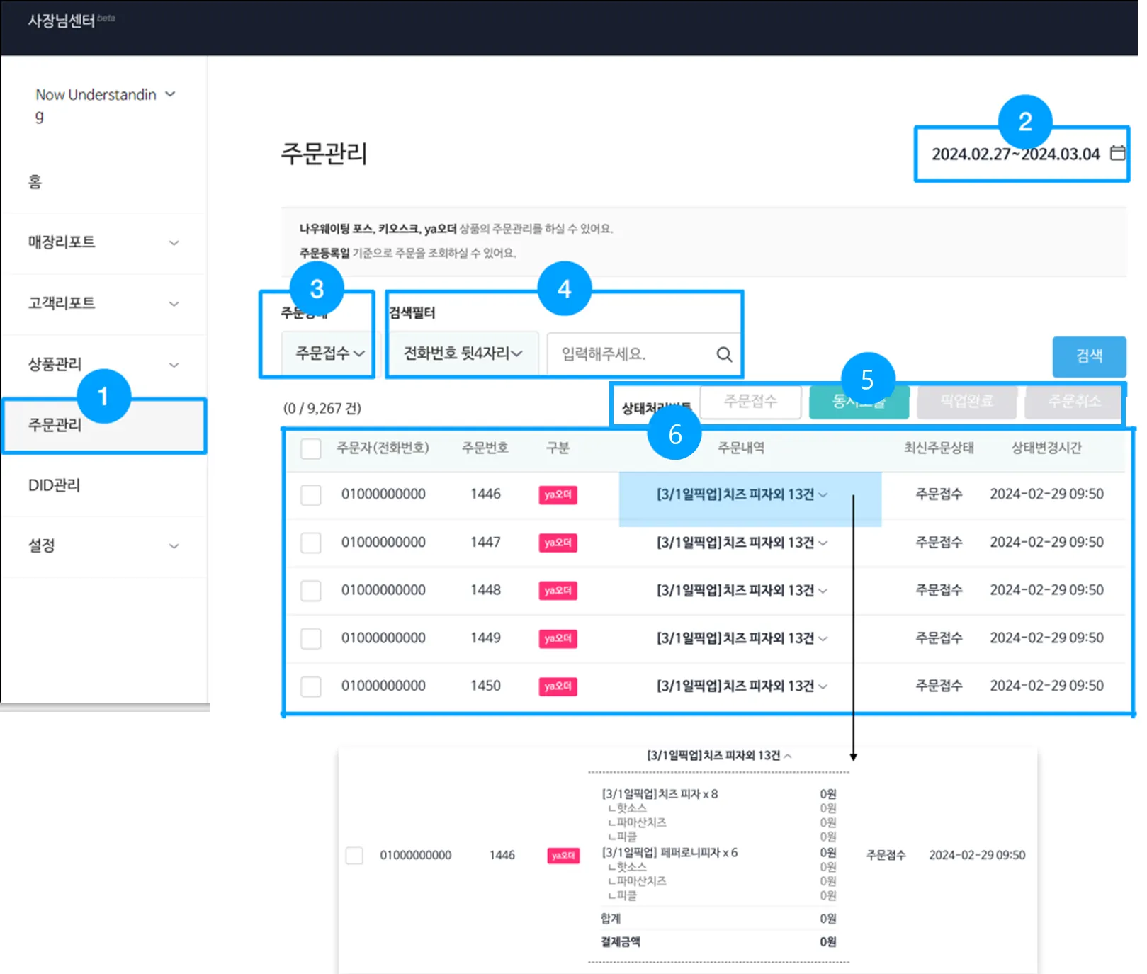 주문번호나 전화번호 뒷 4자리로 주문 내역을 조회할 수 있는 기능입니다. 주문 상태 필터와 함께 사용이 가능하며, 함께 사용 시 원하시는 정보를 빠르고 쉽게 찾을 수 있습니다.