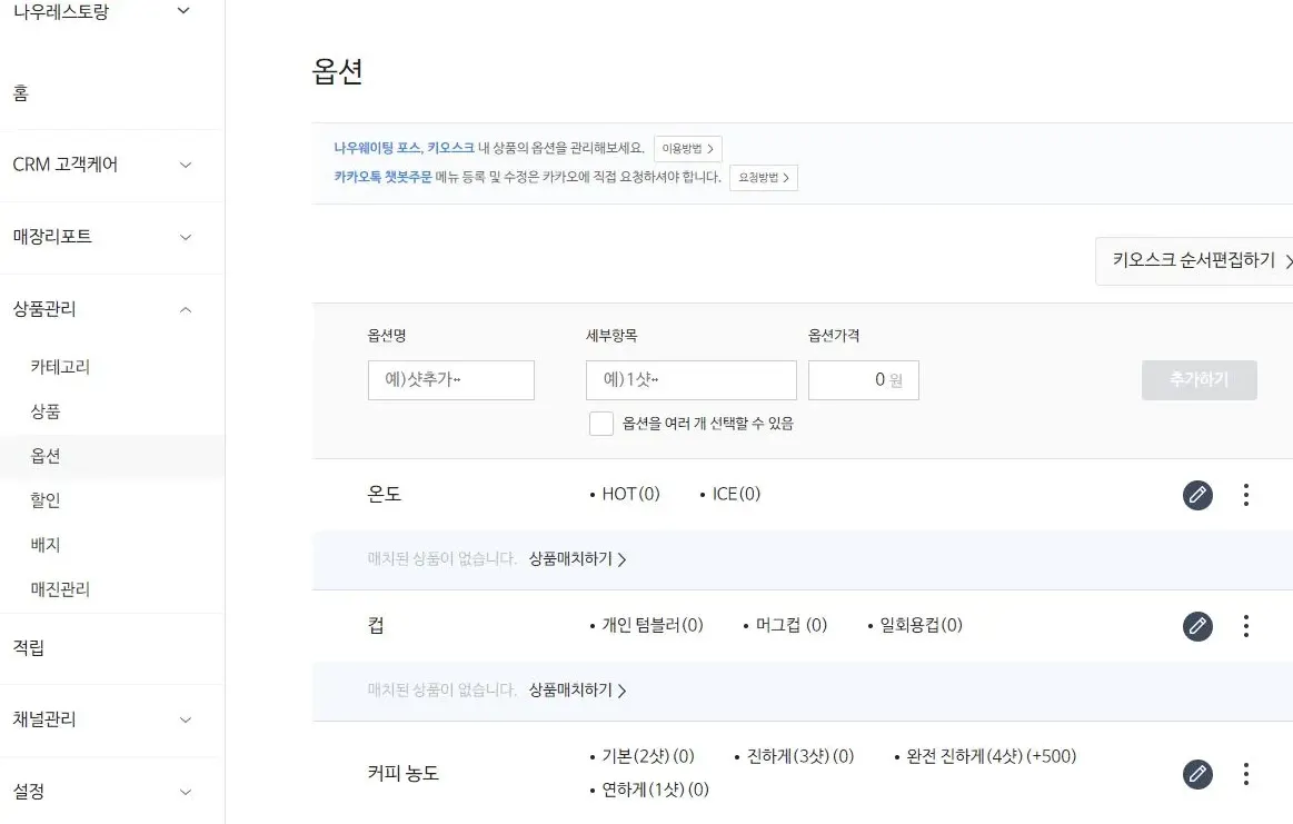 상품의 옵션이 필요한 경우에는 해당 사장님센터에서 옵션을 등록하여 상품에 매칭할 수 있습니다.