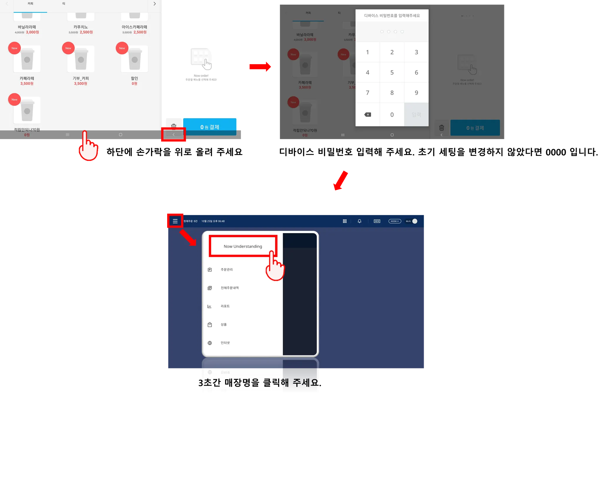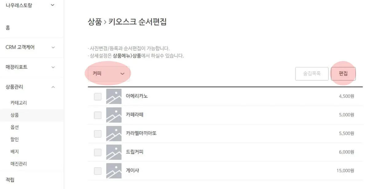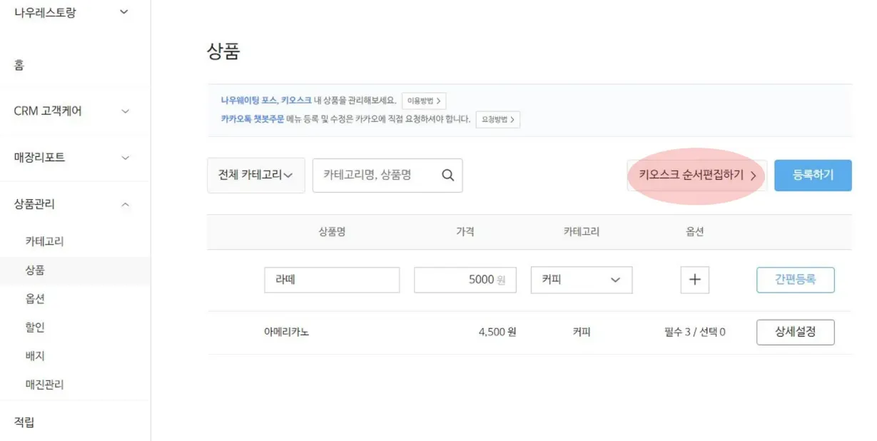 2) 상품관리 > 상품 > 키오스크 순서편집하기를 선택해주세요.