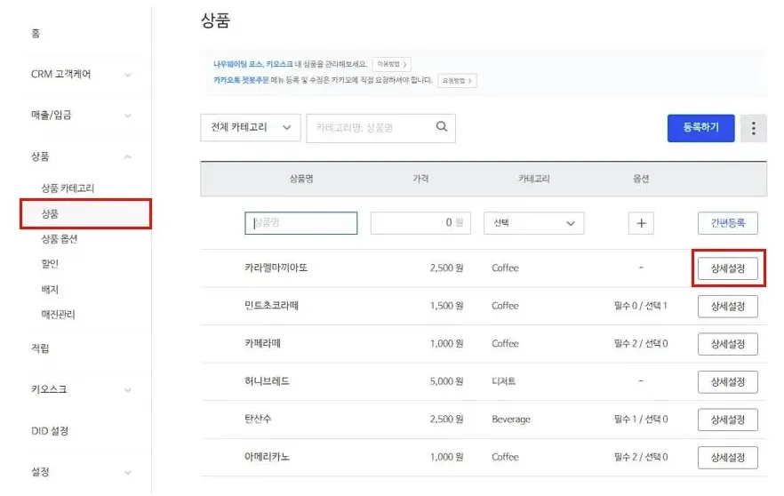 3) 이미지 변경을 원하는 상품(메뉴)의 상세 설정을 클릭하세요.