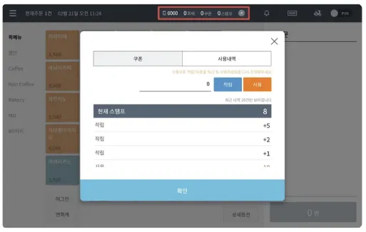 적립 혹은 사용을 원하시는 스탬프 개수를 입력하고 수동으로 적립/사용을 진행합니다.
