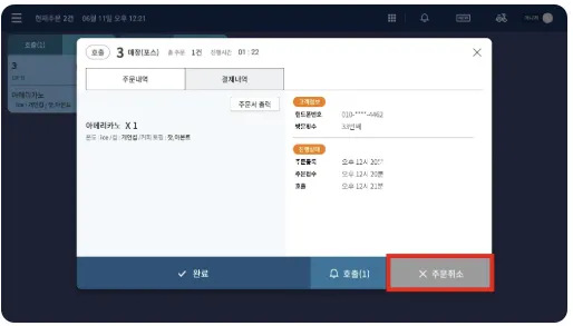 1. 메뉴 제조가 완료되면 주문서의 호출을 눌러주세요.