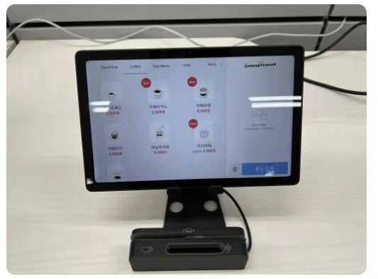고객님께서 키오스크를 사용하실 자리에 거치대를 두고, 태블릿을 가로형으로 세팅을 해 주시면 됩니다.