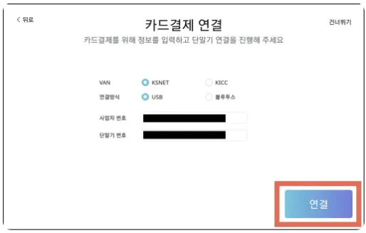 4-2) 카드결제 연결에서 KSNET, USB 선택 후 '사업자 번호', '단말기 번호'를 입력해주세요.