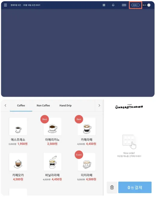 6) 매니저 화면 상단에 있는 'KIOSK' 버튼을 누르면 키오스크가 실행됩니다.