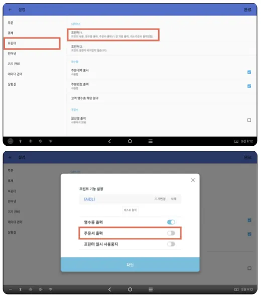 5-2) '프린터'에 들어가서 '프린터 1'을 선택해서 '주문서 출력'을 해제해주세요.