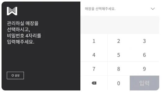 3) 매장 선택 후, 비밀번호 0000을 입력해주세요.* 관리 매장이 1개라면 따로 매장 선택을 하지 않아도 됩니다.