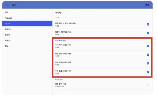 5) 매니저 > 주문 처리시 확인 을 모두 체크해주세요.