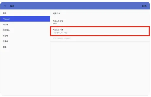 4) 키오스크 > 키오스크 이름을 눌러 매장명 + 매니저앱으로 변경해주세요.예) 나우카페_매니저앱