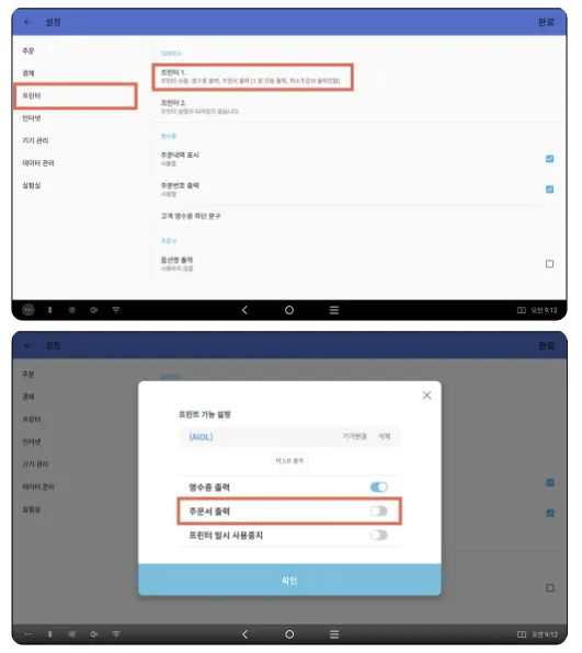 4-3) '프린터'에 들어가서 '프린터 1'을 선택해서 '주문서 출력'을 해제해주세요.