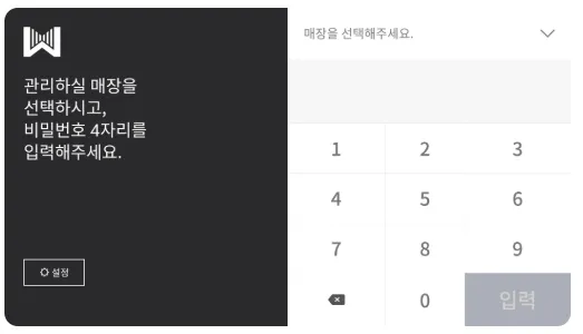 3) 매장 선택 후, 비밀번호 0000을 입력해주세요.* 관리 매장이 1개라면 따로 매장 선택을 하지 않아도 됩니다.