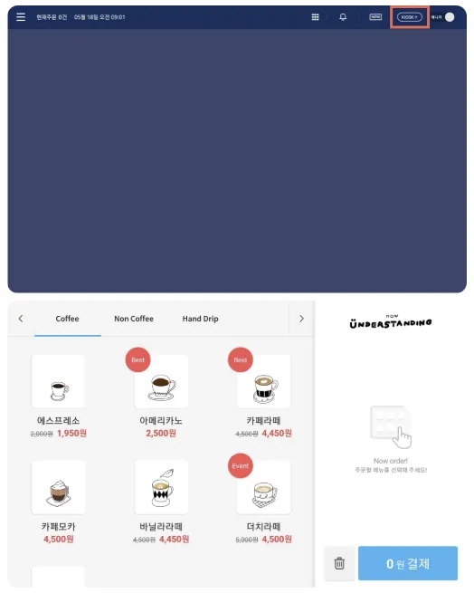 6)매니저 화면 상단에 있는 'KIOSK' 버튼을 누르면 키오스크가 실행됩니다.