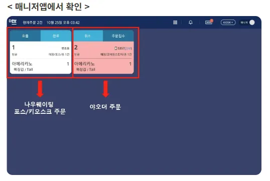 위와 같이 고객의 주문이 접수가 되면, 아래와 같이 나우웨이팅 매니저앱 / 나우웨이팅 사장님센터에서 주문 내역을 확인 및 관리를 하실 수 있습니다.