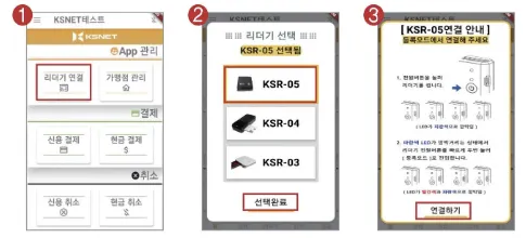 2) 리더기 선택 화면에서 "KSR-05"를 선택 후 > 선택 완료를 눌러주세요.