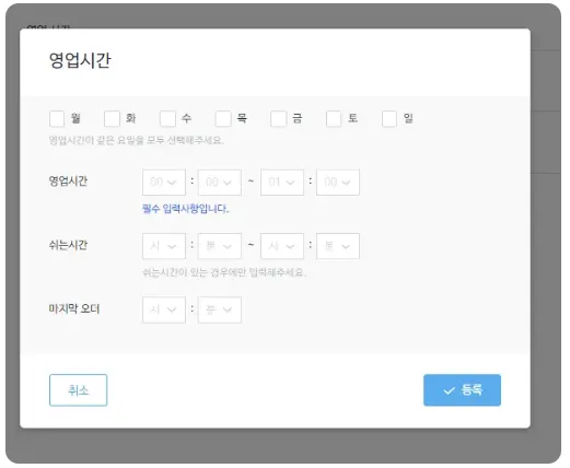 영업 시간 : 필수 기재 항목입니다.