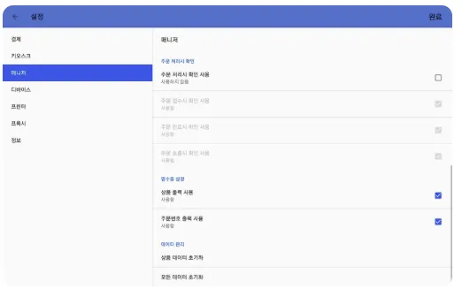 2) 영수증 설정 > 주문번호 출력 사용을 체크한 후, 오른쪽 상단의 완료 버튼을 눌러주세요.