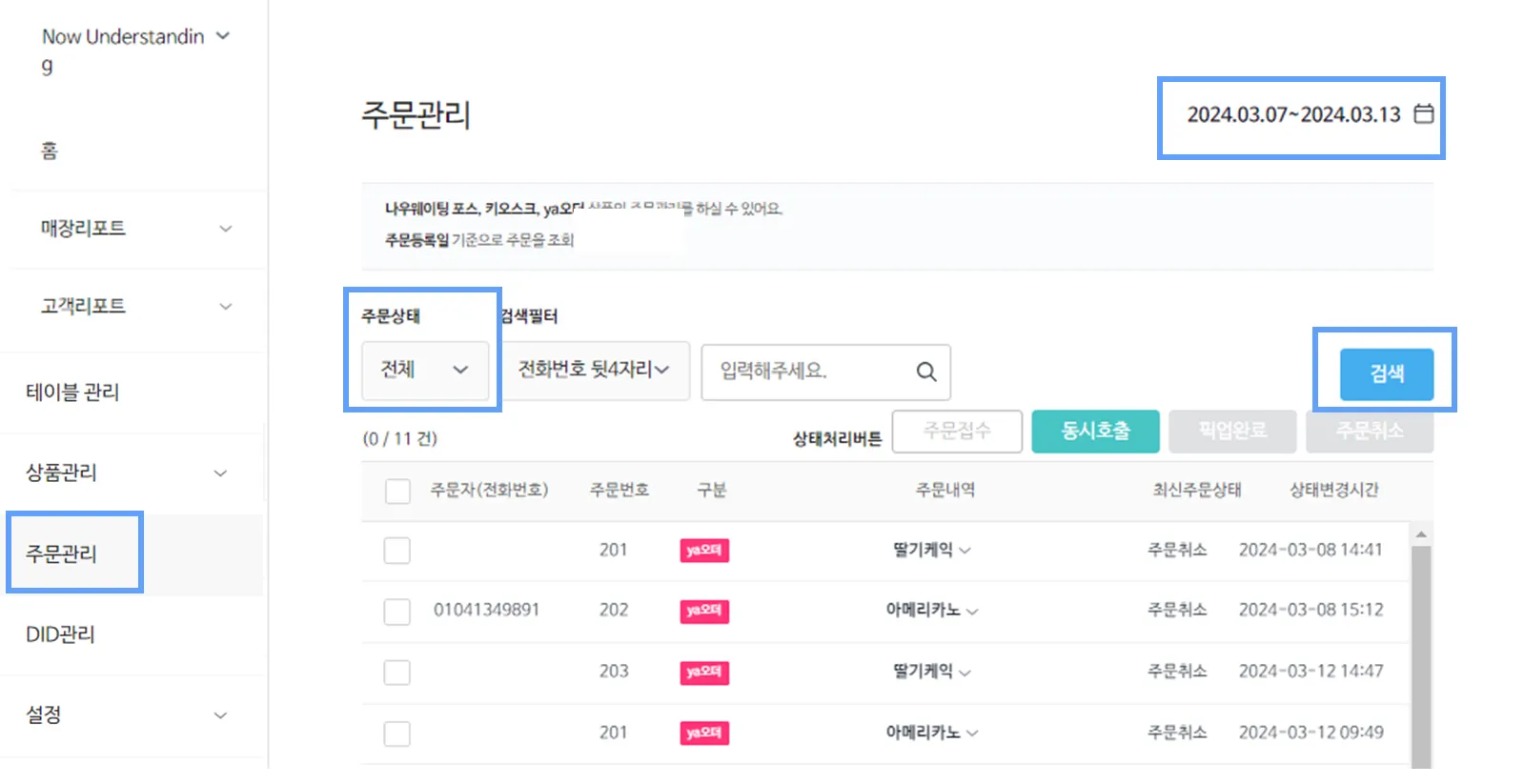 위와 같이 고객의 주문이 접수가 되면, 아래와 같이 나우웨이팅 매니저앱 / 나우웨이팅 사장님센터에서 주문 내역을 확인 및 관리를 하실 수 있습니다.