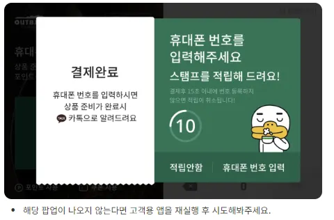 2) 고객용 태블릿에 전화번호를 입력하지 않은 상태에서 테스트 결제를 진행하시고 고객용 태블릿에 아래의 팝업이 나오는지 확인해주세요.