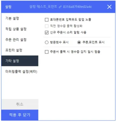 1) PC 프로그램의 설정 > 기타 설정의 [휴대폰번호 입력유도 팝업 노출] 체크 후 [적용 후 닫기] 버튼을 눌러주세요.