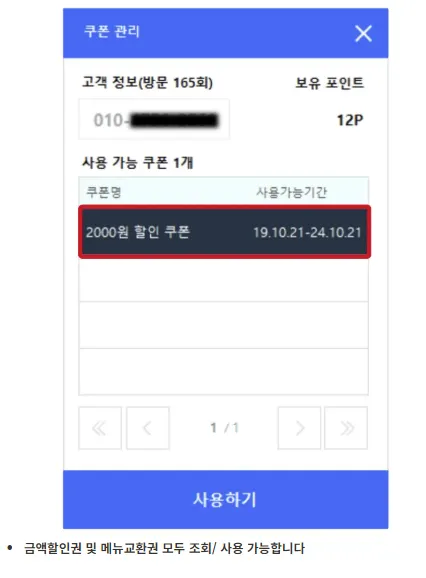 2) 입력된 전화번호 우측에 쿠폰수(방문횟수)가 노출되며, 해당 영역을 클릭하세요.