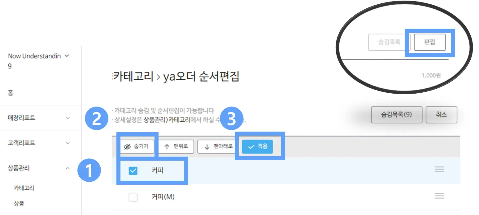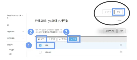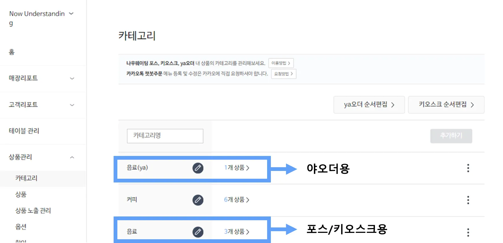 3. 사장님센터 > 카테고리에서 ya오더 순서편집 / 키오스크 순서편집을 이용하시어, 해당 카테고리 여부를 설정해 주세요.