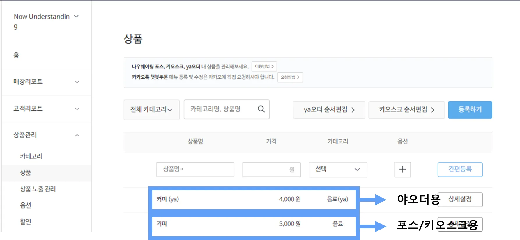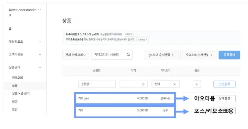 2. 포스 / 키오스크 용 , 픽업오더(야오더) 용으로 상품을 생성해 주세요.