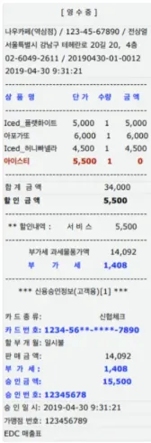 영수증 내 출력되는 정보에는 아래 4가지 항목이 모두 노출되어야 합니다.메뉴명 = (상품명, 아이템, 아이템명, 품명 등) 가격 = (단가, 가격 등)수량 = (갯수, 개수, quantity, qty 등)금액 = (금액, amount 등