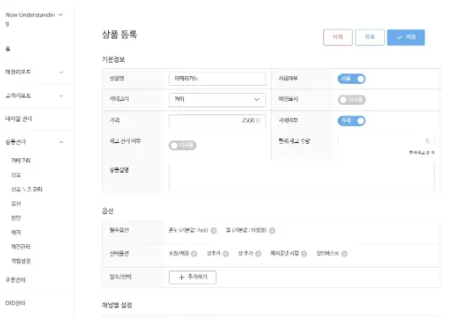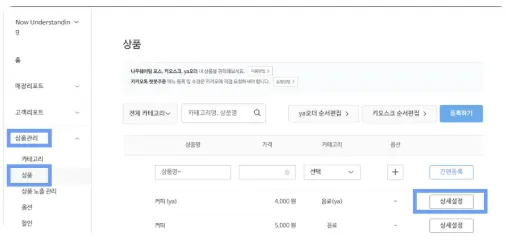 2) 상품관리 > 상품에서 수정 및 삭제를 원하시는 메뉴의 상세 설정을 누릅니다.
