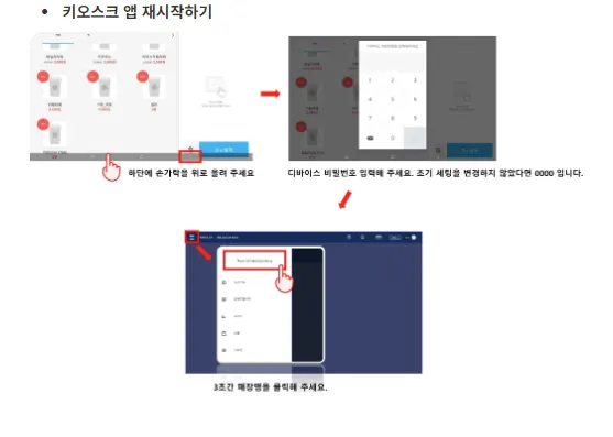 1) 사장님센터 내 메뉴 정보를 변경한 후에는 포스/키오스크를 재시작하거나, 재부팅을 해주셔야 수정된 내용이 반영됩니다.