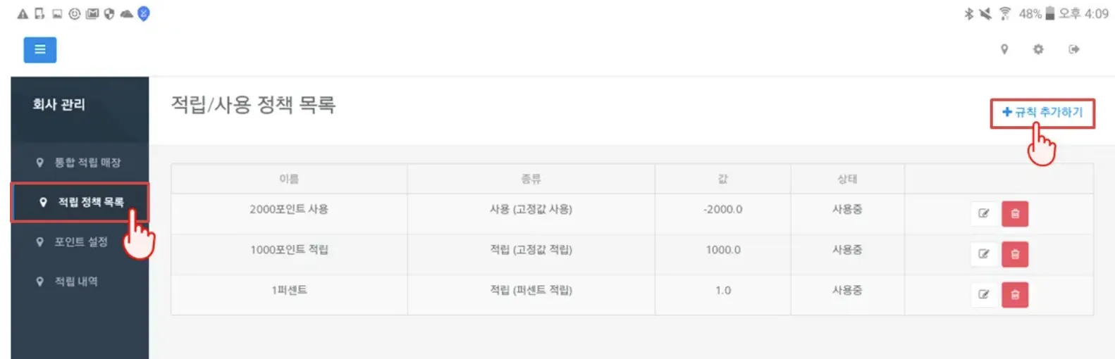 좌측의 [적립 정책 목록]을 누른 후, [규칙 추가하기]를 눌러주세요.