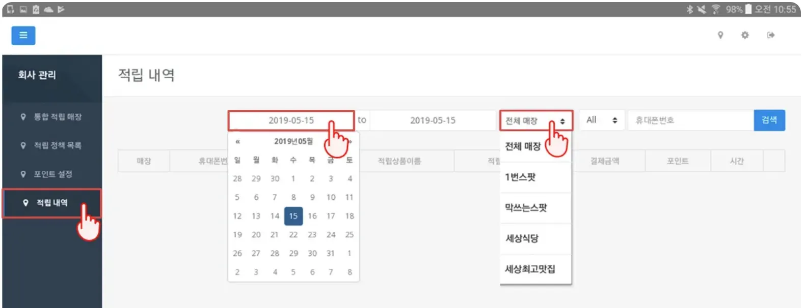 본사는 통합포인트 관리페이지에서 모든 매장의 포인트 적립규칙을 설정하고, 관리할 수 있습니다.