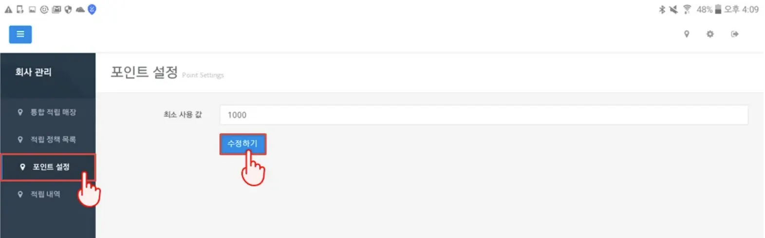 왼쪽 메뉴 중 [포인트 설정]을 누른 후, 최소로 사용 가능한 값을 입력한 뒤 [수정하기]를 누릅니다.